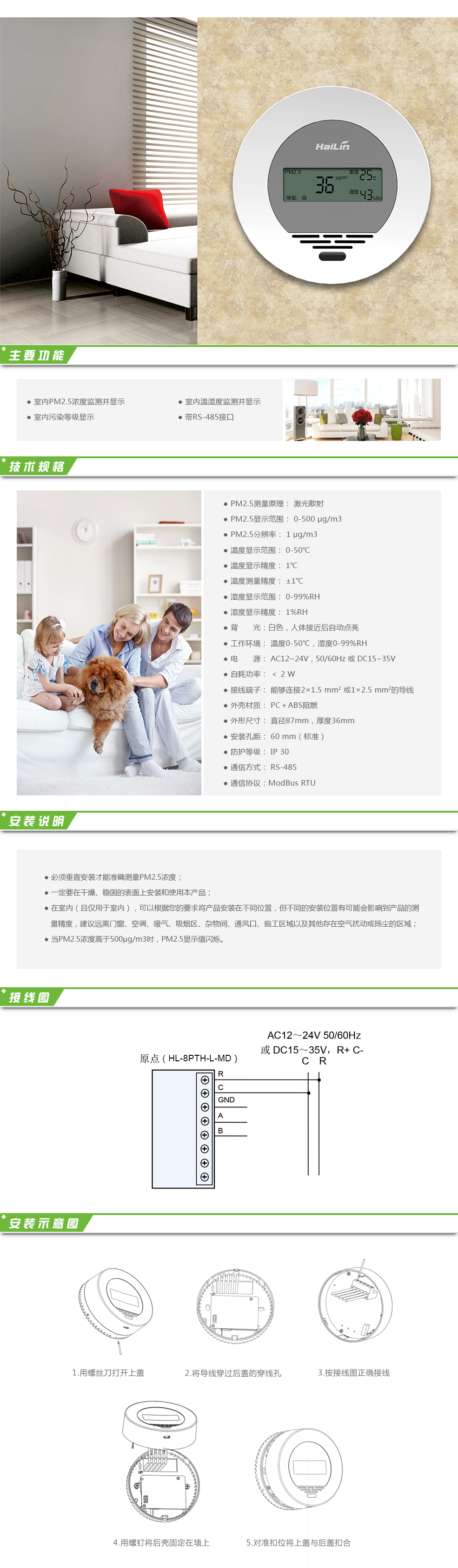 海林原點PM2.5傳感器可實現(xiàn)室內(nèi)空氣質(zhì)量的實時監(jiān)測,通過光散射原理對空氣中的PM2.5進行檢測,由微處理器對檢測數(shù)據(jù)進行運算并將運算結(jié)果與污染等級同時顯示在液晶上,同時集成了溫濕度的測量與顯示。采用表面安裝方式可實現(xiàn)對室內(nèi)PM2.5濃度、溫度及濕度進行測量并顯示,通過RS485(Modbus)將數(shù)據(jù)上傳。帶紅外接近感應(yīng)功能,有人接近傳感器前方時啟動一次粉塵檢測,同時點亮背光,便于用戶查看PM2.5濃度以及溫度、濕度等數(shù)據(jù)。
