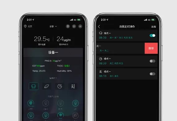 通過(guò)手機(jī)App,可以實(shí)現(xiàn)一鍵集中控制全屋的情景模式:一鍵全屋舒適、全屋節(jié)能等模式。也可以實(shí)現(xiàn)一鍵關(guān)空調(diào)、一鍵關(guān)燈等具體設(shè)備的具體控制。
