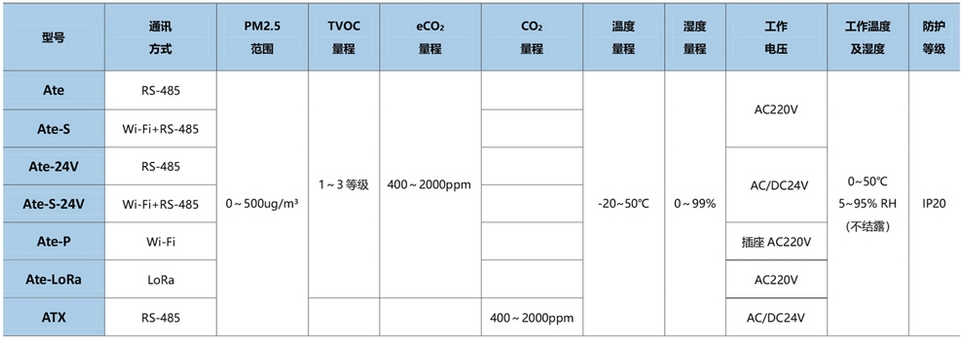 Ate 是一款五合一的空氣質量傳感器,用于室內多種空氣參數的測量,包括溫度、濕度、PM2.5、CO?/eCO? 和 TVOC。配備 Wi-Fi、RS-485、LoRa 或 ZigBee 等多種通訊方式, 適用于各種樓宇自控系統。