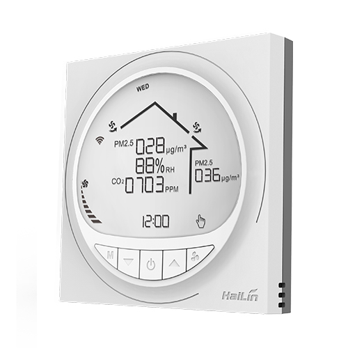 豪華型大液晶顯示新風控制器,可通過無線 APP 遠程操控,適用于工業、商業及 家庭居室的新風控制,可選擇風機為室內、室外循環模式,風機三速(自動、高、中、 低、關閉)可調,帶 RS485 通訊轉換控制。 新風控制器采用微電腦控制技術,大屏幕液晶顯示,可從云端獲取室內環境信息 并可通過液晶顯示:PM2.5 濃度顯示(ug/m3)、濕度顯示(%RH)、CO2濃度顯示(PPM)、 時鐘顯示 ...