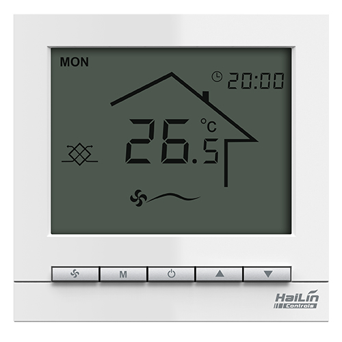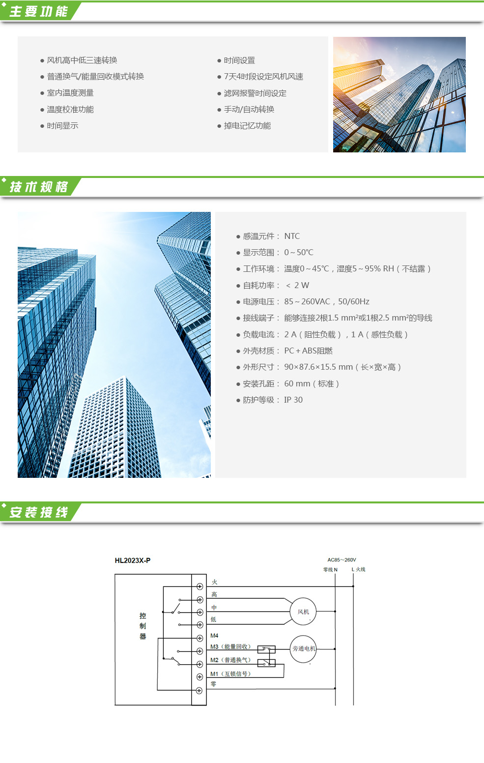 新風控制器HL2023X-P主要用于控制新風換氣機,設備包含一個單排機及一個旁通電機。通過控制器面板上的按鍵可以控制新風換氣機的啟停、速度的切換,手動/自動轉換,以及普通換氣與能量回收兩種工作模式的切換。