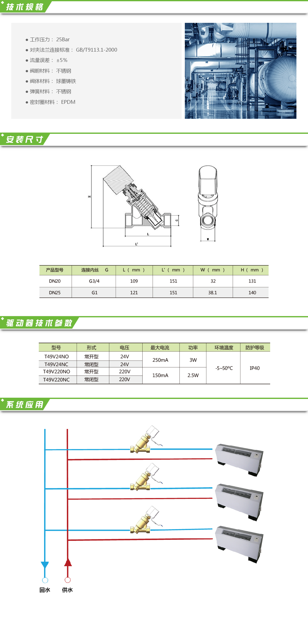 本系列產(chǎn)品主要用于解決暖通空調(diào)系統(tǒng)中的水力失調(diào)問題,是集動態(tài)平衡和電動二通與一體的產(chǎn)品,特點是抗干擾能力強,控制精度高,在系統(tǒng)負荷波動較大的變流量系統(tǒng)中優(yōu)勢明顯。根據(jù)設備的輸入信號對電熱式開關驅動器進行動作,實現(xiàn)閥門的開關功能。主要適用于暖通空調(diào)系統(tǒng)末端空調(diào)設備,可對各環(huán)路的流量、溫度進行自動控制,實現(xiàn)合理利用能源。