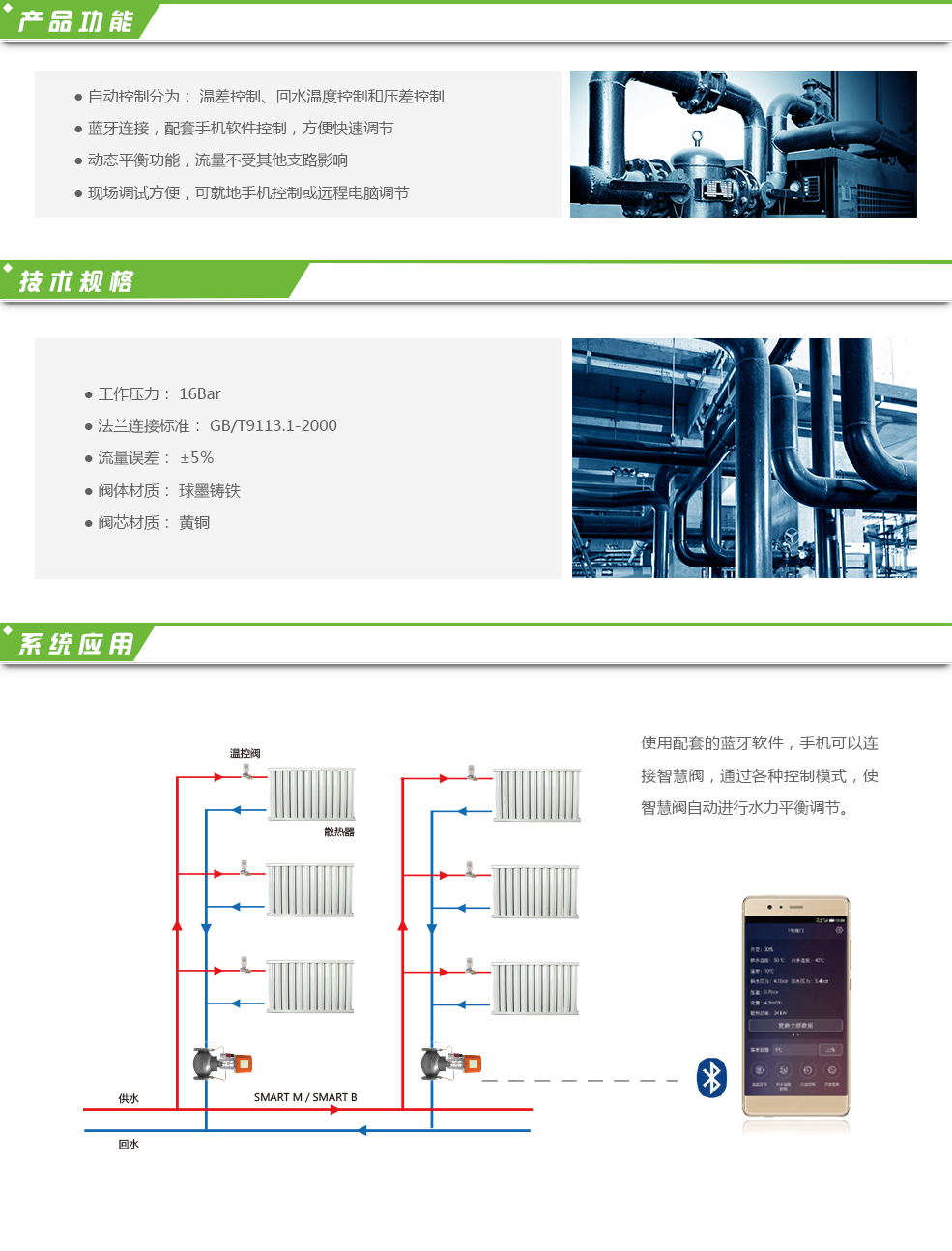 智慧平衡閥SMART B是基于嵌入式軟件、傳感技術、人工智能算法、流體模擬計算等技術,結合傳感器、智能控制器、執行器和平衡閥等產品優勢,實現智能化操作的閥門裝置。可應用于建筑管網動態流量平衡、動態壓差平衡、動態溫度平衡的調節控制。