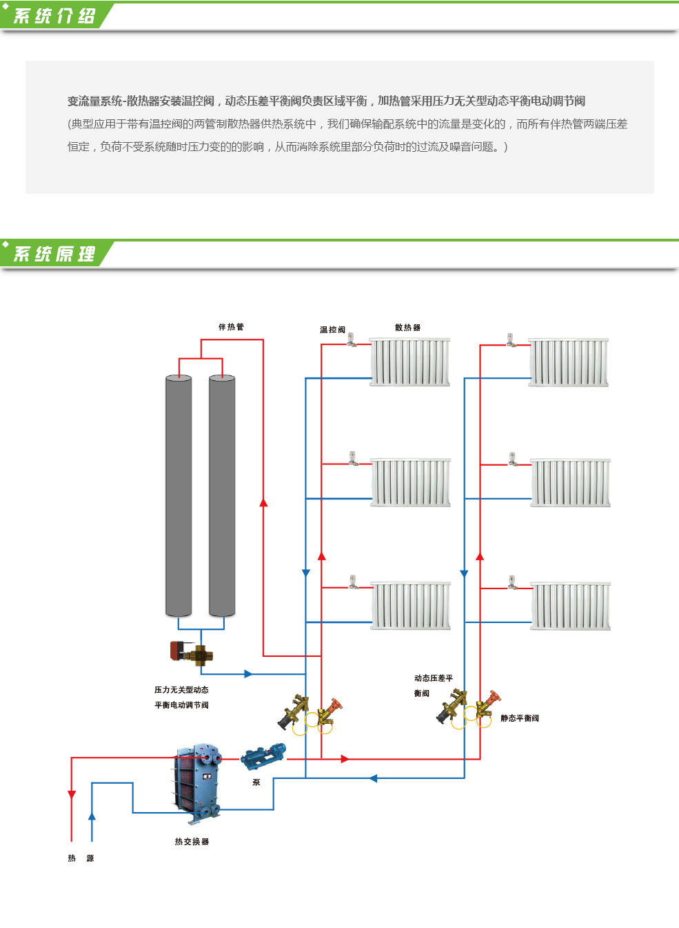 散熱器安裝溫控閥,動態壓差平衡閥負責區域平衡,加熱管采用壓力無關型動態平衡電動調節閥